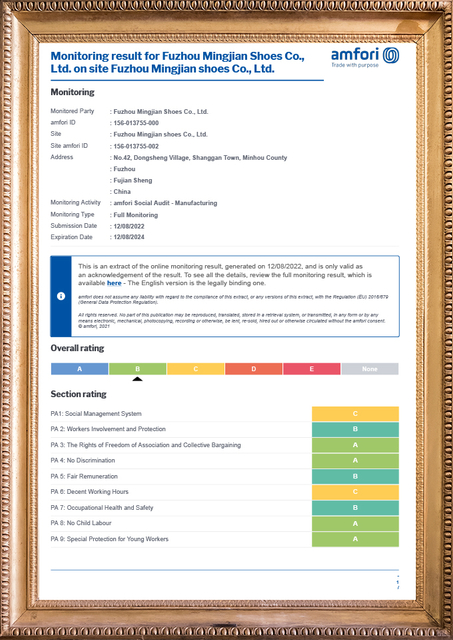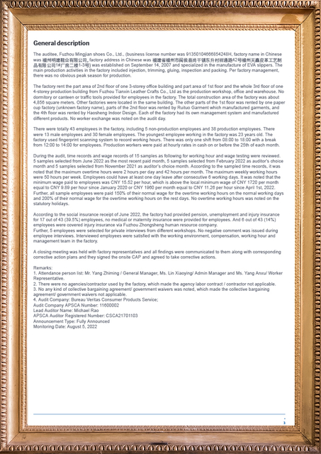 La empresa es un fabricante de calzado vertical auditado por BSCI en China, con una superficie de más de 20.000 metros cuadrados, 8 máquinas de moldeo por inyección de EVA, 6 líneas de producción, que producen más de 1.500.000 pares por mes y una producción mensual de 18.000.000 pares por año. .
